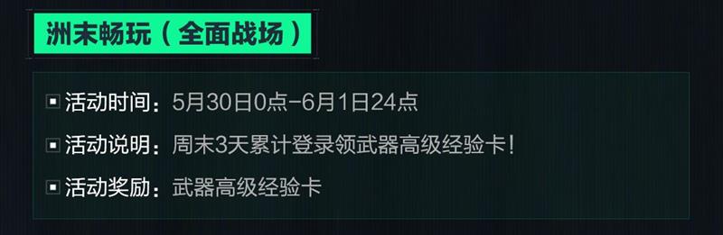 活动时间为 5 月 30 日 0 点至 6 月 1 日 24 点。周末 3 天累计登录领武器高级经验卡!活动奖励为武器高级经验卡。