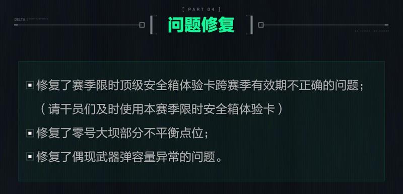 修复了赛季限时顶级安全箱体验卡跨赛季有效期不正确的问题,提醒干员们及时使用本赛季限时安全箱体验卡。同时修复了零号大坝部分不平衡点位,以及偶现武器弹容量异常的问题。