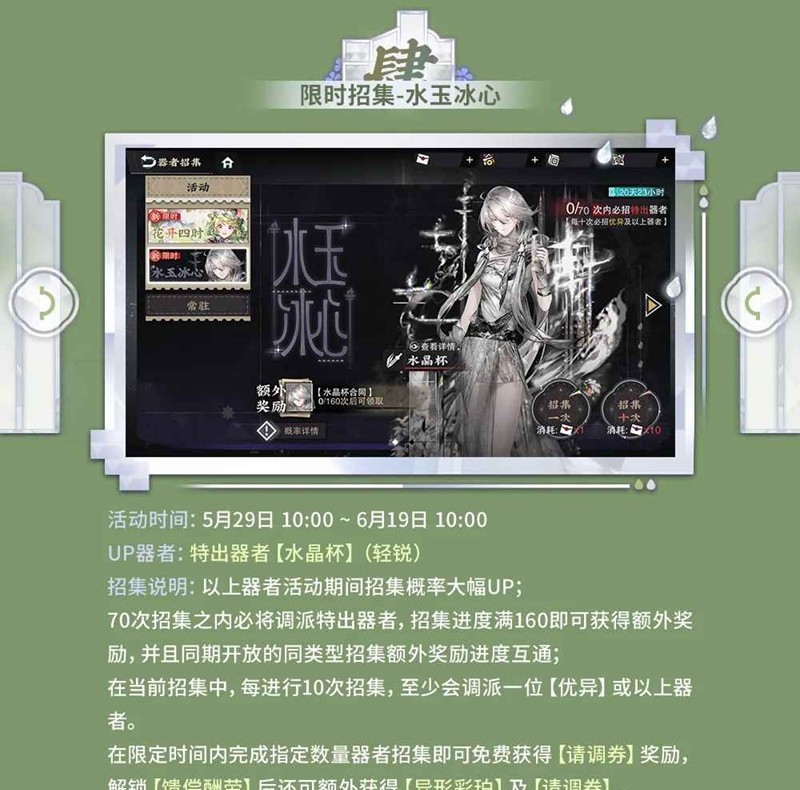 ※ 活动期间,特出器者【百花图卷】仅可在「花开四时」限时招集中获取,特出器者【水晶杯】仅可在「水玉冰心」限时招集中获取。