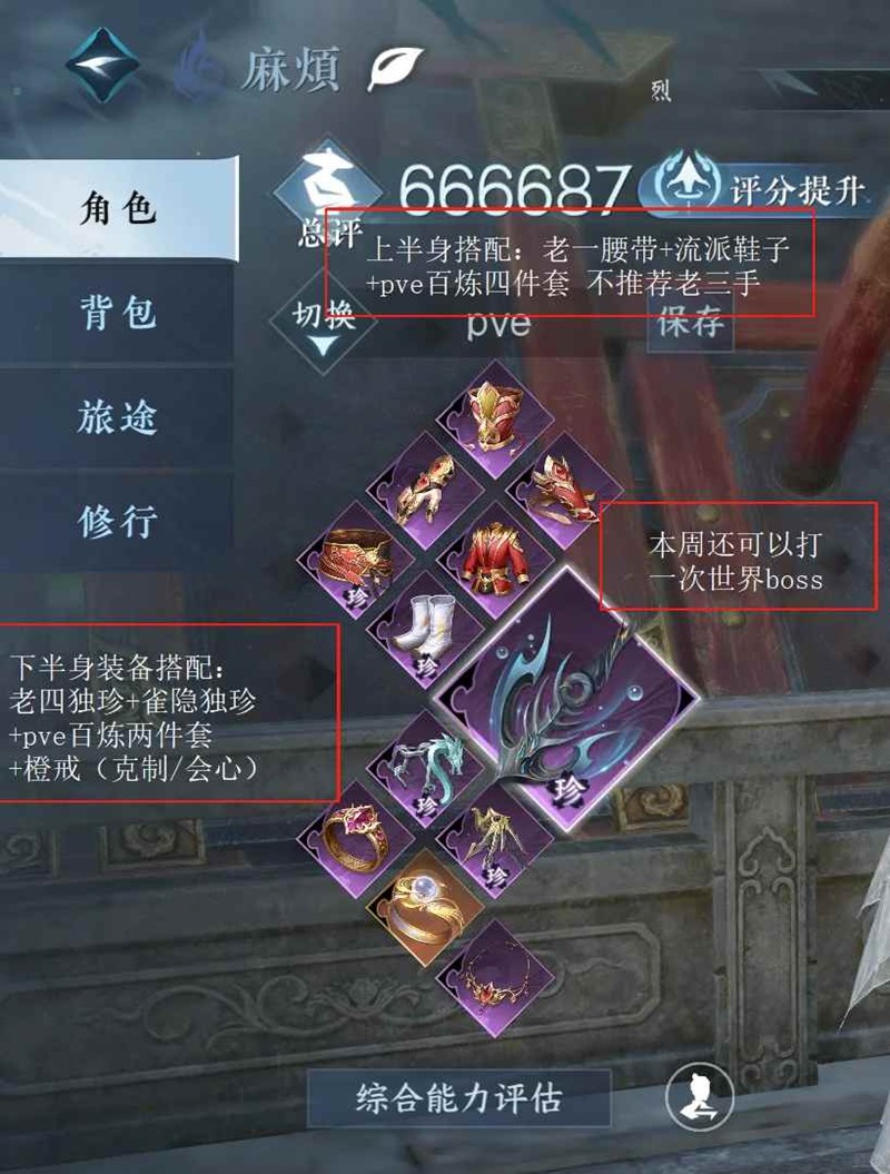 下半身搭配:老四独珍+雀隐独珍tpve百炼两件套+橙戒(会心)