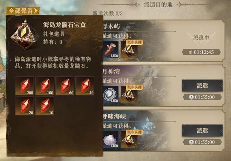 海岛玩法派遣任务优先级:前期优先选择含先祖红木的任务。先祖红木是升级海岛建设的核心资源,尽早提升海岛等级,解锁属性加成与技能,可大幅降低开荒难度。