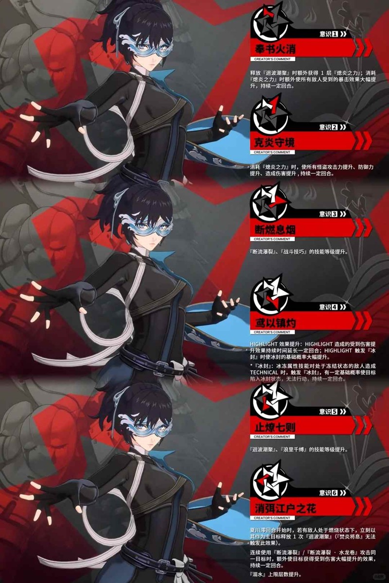 三技能(有t):两层熄炎之力解锁,群体降防并造成technical,使冰灼升级为寒煌,受到伤害提升;四层熄炎之力解锁升级版,降防更多,其余相同(每消耗一层熄炎之力敌人受到伤害提升,最多叠加4层)
