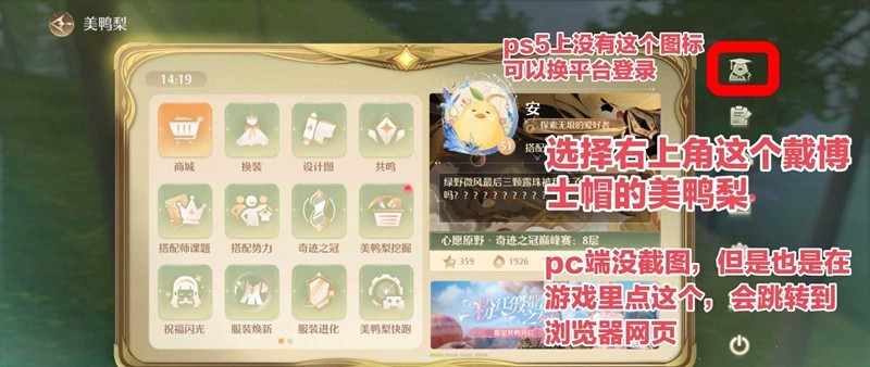 pc端可以从『游戏内』点博士帽美鸭梨跳转到浏览器网页进入,操作都是差不多的,部分描述有差别