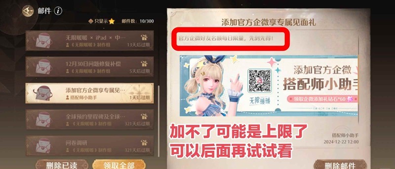 『添加暖5官方企业微信』加不了有可能是上限了,因为在邮件里提到过,可以在游戏内先试试看呢,或者过一段时间