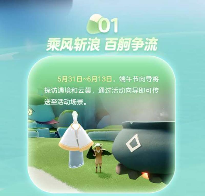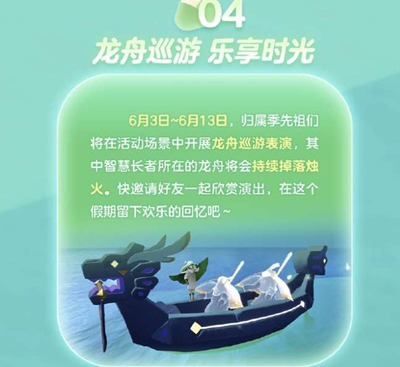 《光·遇》端午节活动已于5月31日正式开启,持续至6月13日。本次端午节活动以“竞渡逐光,万愿归舟”为主题,为玩家们准备了丰富的节日福利和精彩活动,让玩家在天空王国中感受传统节日的魅力。