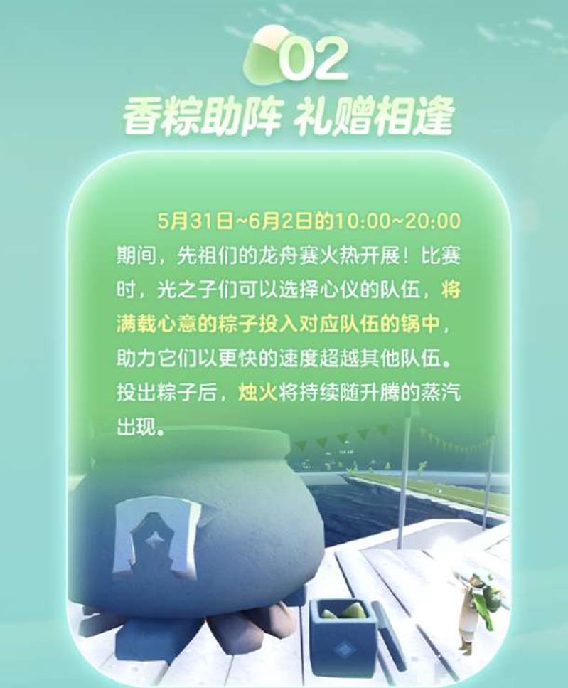 端午赠礼:玩家通过完成活动页面的任务,如阅览龙舟知识、每日前往龙舟赛场等,可获得击鼓行舟魔法、传信纸船、绿色染料、冥龙克星、爱心等奖励。大蜡烛堆:天空王国的各个角落将出现多簇大蜡烛堆,供玩家收集。