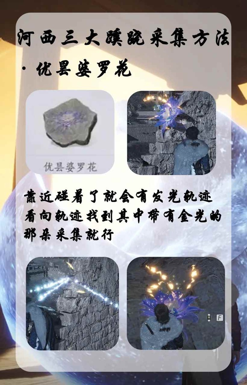 优昙婆罗花:这玩意咱们碰一下花儿就能看到花儿飘出的轨迹,看向轨迹找到其中带金色特效的花儿采集就行嘞