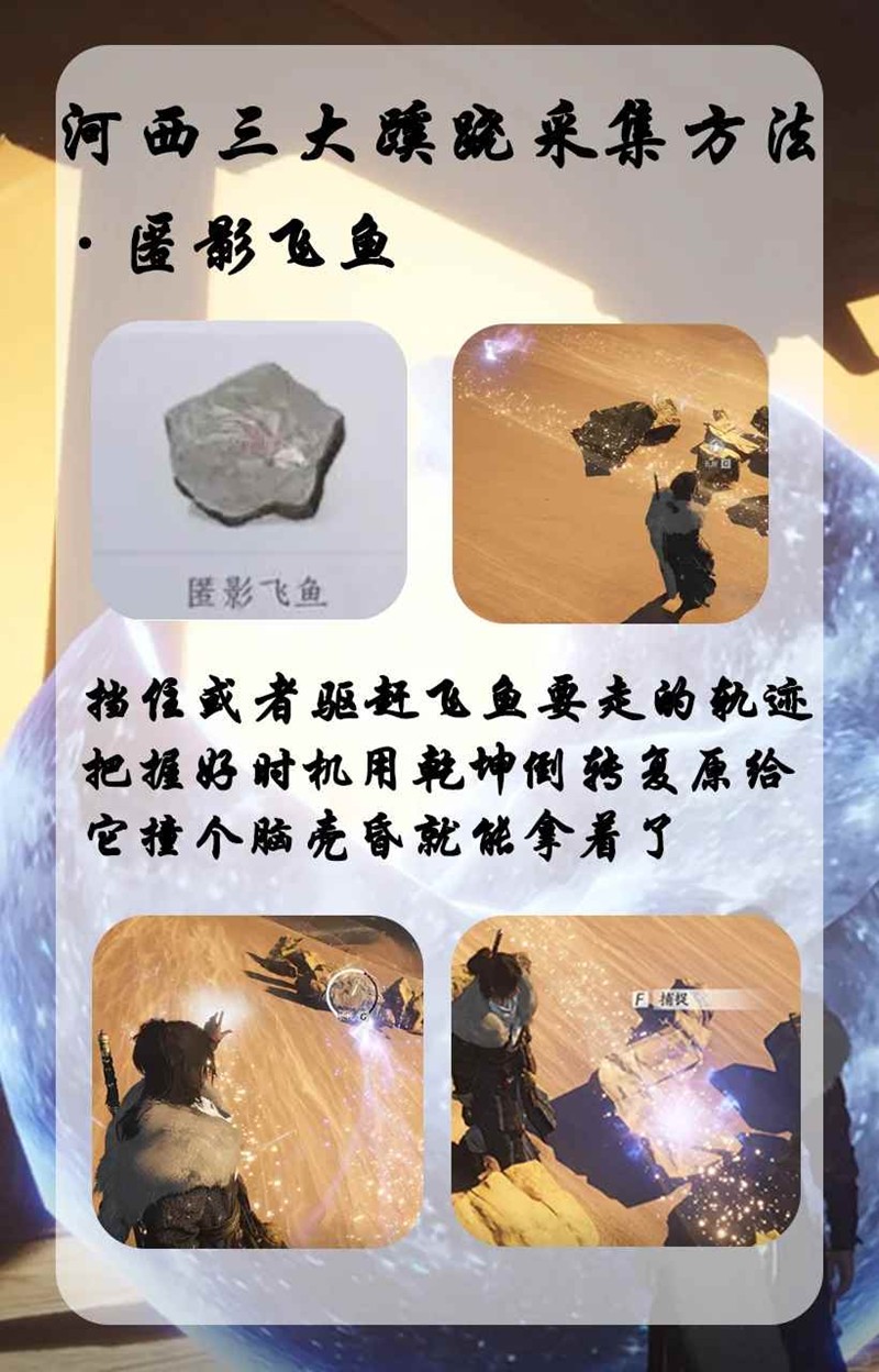 匿影飞鱼:咱们可以挡住或者驱赶飞鱼要走的轨迹,咱把握好时机用乾坤倒转复原给它撞个脑壳昏就能拿了