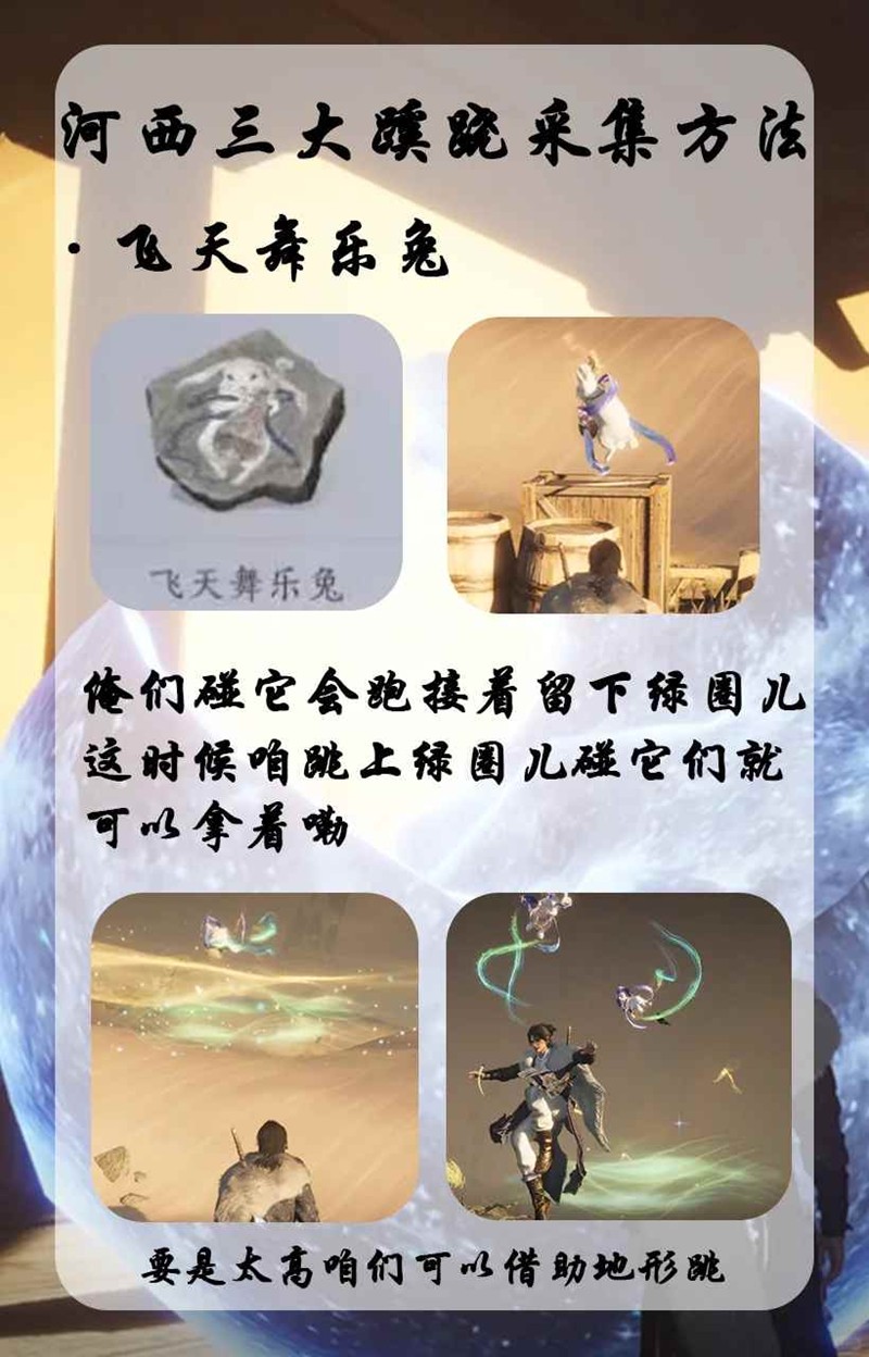 飞天舞乐兔:俺们碰它一哈儿就会跑,接着往留下绿圈儿上跳,碰到它们就可以拿着嘞(要是太高咱可以借助地形跳可别傻楞的原地蹦)