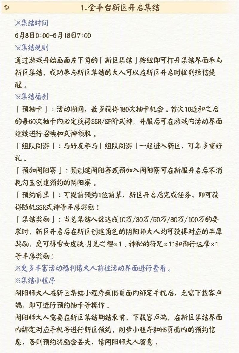 在集结福利方面,「预抽卡」活动期间最多可获得 180 次抽卡机会,首次 10 连和之后的每 60 次抽卡内必定获得 SSR / SP 式神,升服后可在游戏内活动界面继续进行召唤和式神领取。「组队同游」模式下,与好友一起进入新区可享多重好礼。「预加阴阳寮」功能允许预创建阴阳寮或预加入阴阳寮,新服开启后不消耗勾玉创建预约的阴阳寮。「预约前辈」玩法允许提前预约 1 位前辈,新区开启后完成任务可获随机 SSR 式神等奖励。「集结奖励」则根据总集结人数达成不同要求,新区开启后创建角色的阴阳师大人可获对应奖励,包括雪女皮肤・月见之樱、神秘的符咒 × 11 和御行达摩 × 1 等。
