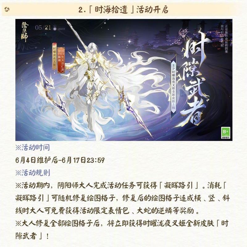 活动时间为 6 月 4 日维护后 - 6 月 17 日 23:59。活动期间,阴阳师大人完成活动任务可获得「凝晖路引」,消耗「凝晖路引」可随机修复绘图格子,修复后的绘图格子连成横、竖、斜线时可免费获得活动限定表情包、大蛇的逆鳞等奖励。当大人修复全部绘图格子后,将立即获得时渊夜姬全新皮肤「时隙武者」。