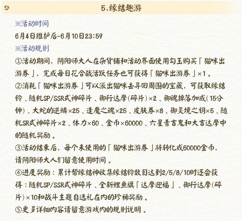 活动时间为 6 月 4 日维护后 - 6 月 10 日 23:59。活动期间,大人可在杂货铺和活动界面使用勾玉购买「猫咪出游券」,完成每日花合战活跃任务也可获得「猫咪出游券」× 1。消耗「猫咪出游券」可以派出猫咪去寻回周围的宝藏,可获取缘结铃、随机 SP / SSR 式神碎片、御行达摩(碎片)× 2、御魂掉落加成(15 分钟)、大蛇的逆鳞 × 25、逢魔之魂 × 25、皮肤券 × 8、御灵境之钥 × 5、随机 SR 式神碎片 × 2、体力 × 60、金币 × 60000、六星青行灯和大吉达摩中的随机奖励。活动结束后,未使用的「猫咪出游券」将转化成 60000 金币。此外,累计帮缘结神收集缘结铃数目达 2 / 5 / 8 / 10 时还可获得随机 SP / SSR 式神碎片、全新鲤鱼旗「达摩迎福」、御行达摩(碎片)× 10 和战斗主题自选礼内的珍稀奖励。