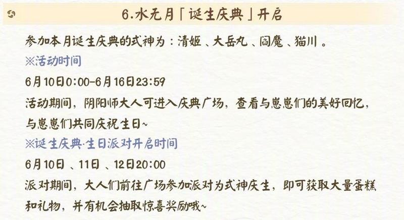 本次活动时间为 6 月 10 日 0:00 - 6 月 16 日 23:59,参与活动的式神包括清姬、大岳丸、阎魔、猫川。活动期间,阴阳师大人可进入庆典广场,查看与崽崽们的美好回忆,与崽崽们共同庆祝生日。6 月 10 日、11 日、12 日 20:00 为诞生庆典・生日派对开启时间,派对期间大人前往广场参加派对为式神庆生,即可获大量蛋糕和礼物,并有机会抽取惊喜奖励。