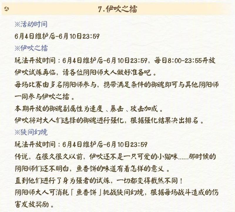 活动时间为 6 月 4 日维护后 - 6 月 10 日 23:59。玩法开放时间为 6 月 4 日维护后 - 6 月 10 日 23:59,每日 8:00 - 23:55 开放。每场比赛由多名阴阳师参与,携带满足条件的御魂即可与其他阴阳师一同参与伊吹之擂。本期伊吹开放的御魂副属性为速度、暴击、攻击加成。伊吹之擂将对大人选择的御魂进行强化,根据强化结果决出排名。此外,狭间幻境玩法开放时间同样为 6 月 4 日维护后 - 6 月 10 日 23:59。传说很久很久以前,伊吹还不是一只可爱的小猫咪,阴阳师们还不明白鱼香饼的味道有怎样的意义,直到他们进行了身为强者的试炼,一切才变得截然不同。大人可消耗「鱼香饼」挑战狭间幻境,根据每场战斗造成的伤害发放奖励。