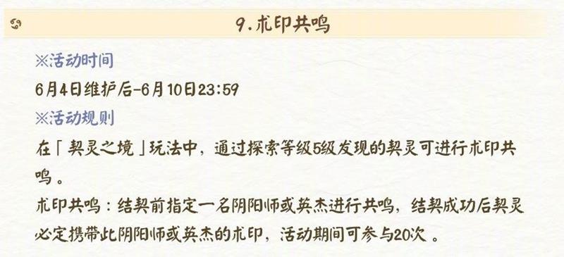 活动时间为 6 月 4 日维护后 - 6 月 10 日 23:59。在「契灵之境」玩法中,通过探索等级 5 级发现的契灵可进行术印共鸣。术印共鸣时,大人可结契前指定一名阴阳师或英杰进行共鸣,结契成功后契灵必定携带比阴阳师或英杰的术印,活动期间可参与 20 次。
