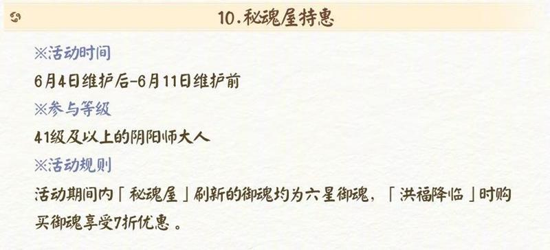 活动时间为 6 月 4 日维护后 - 6 月 11 日维护前,参与等级为 41 级及以上的阴阳师大人。活动期间「秘魂屋」刷新的御魂均为六星御魂,「洪福降临」时购买御魂享受 7 折优惠。