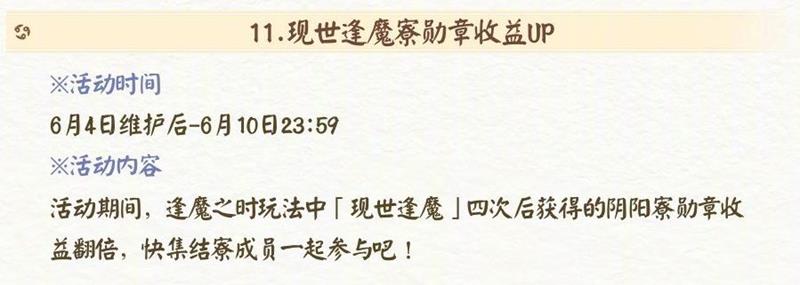 活动时间为 6 月 4 日维护后 - 6 月 10 日 23:59。活动期间,逢魔之时玩法中「现世逢魔」四次后获得的阴阳寮勋章收益翻倍。
