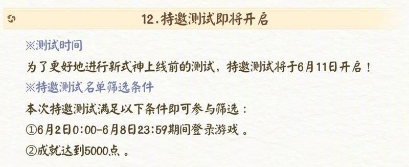 特邀测试将于 6 月 11 日开启,满足以下条件的阴阳师大人可参与筛选:6 月 2 日 0:00 - 6 月 8 日 23:59 期间登录游戏且成就达到 5000 点。