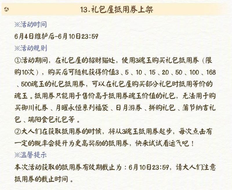 活动时间为 6 月 4 日维护后 - 6 月 10 日 23:59。活动期间,在礼包屋的招财猫处使用 3 魂玉购买礼包抵用券(限购 10 次),购买后将随机获得价值 3、5、10、15、20、50、100、168、500 魂玉的礼包抵用券,可用于礼包屋购买部分礼包时抵用等价的魂玉,但无法用于购买御川礼券、月曜永恒系列福袋、日月游券、拼购礼包、蒲节纳吉礼包、端午育食包等。大人获取抵用券时从 3 魂玉抵用券起步,每次点击有一定的概率提升为更高奖励的抵用券。本次活动获取的抵用券有效期截止为 6 月 10 日 23:59。