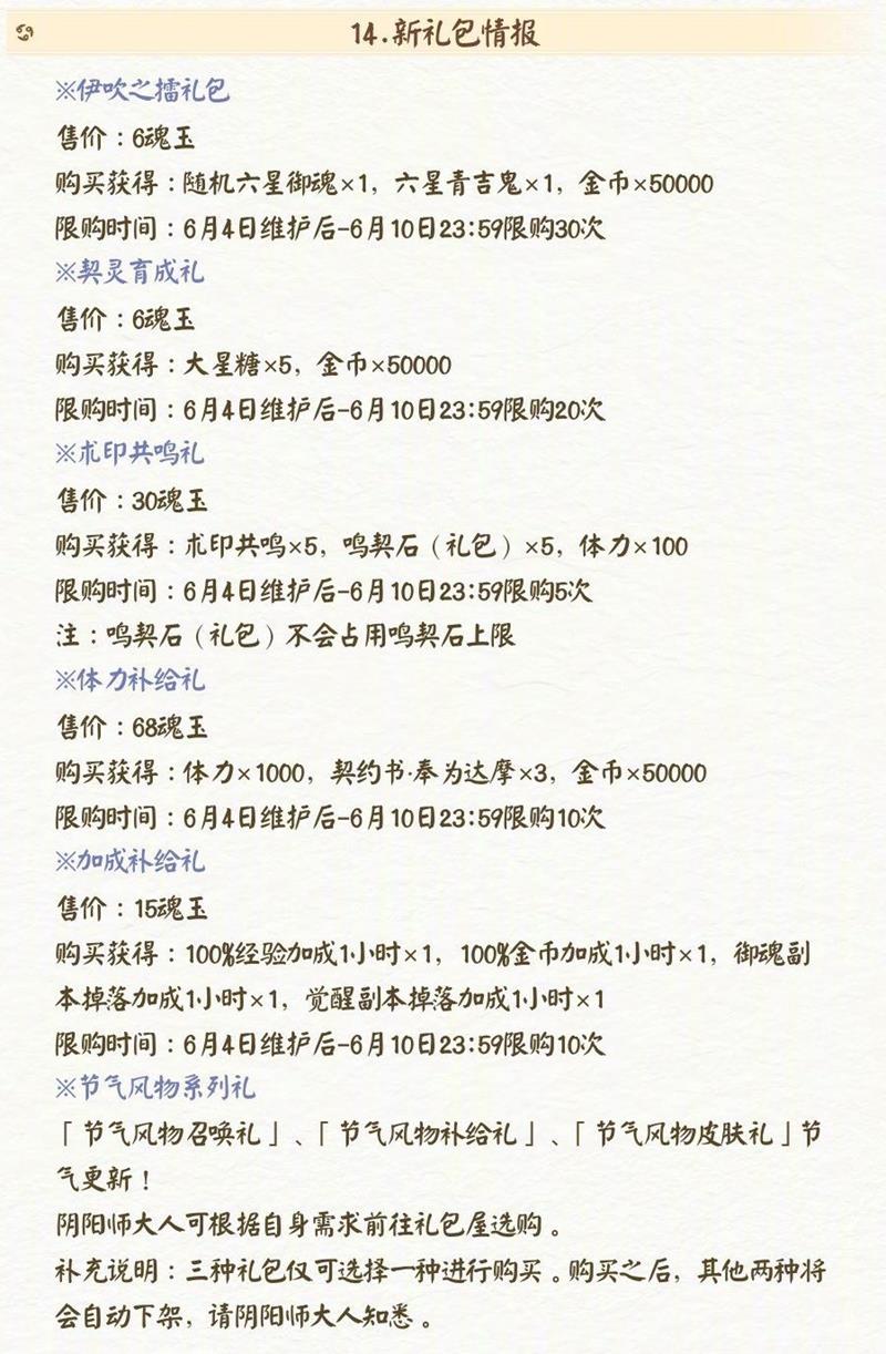 6 月 4 日维护后 - 6 月 10 日 23:59 期间,游戏上架了多个新礼包,包括售价 6 魂玉的伊吹之擂礼包、契灵育成礼、术印共鸣礼,售价 68 魂玉的体力补给礼,售价 15 魂玉的加成补给礼以及节气风物系列礼。大人可根据自身需求前往礼包屋选购,但需注意节气风物系列礼的三种礼包仅可选择一种购买,购买后其他两种将自动下架。