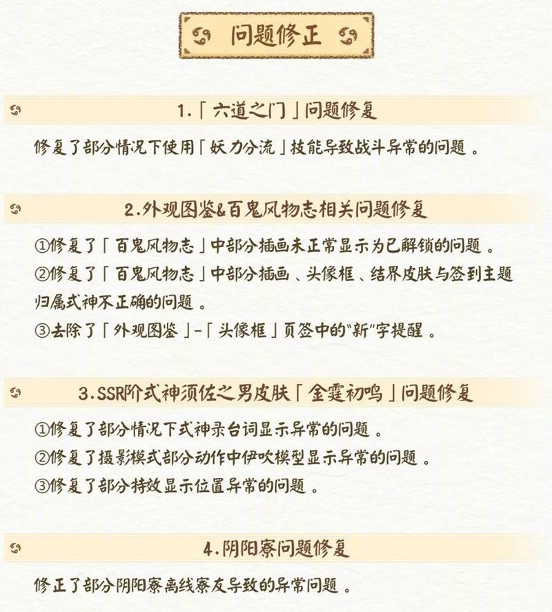 开发团队还修复了「六道之门」问题、外观图鉴 & 百鬼风物志相关问题、SSR 级式神须佐之男皮肤「金霆初鸣」问题以及阴阳寮相关问题,提升了游戏的稳定性和体验。