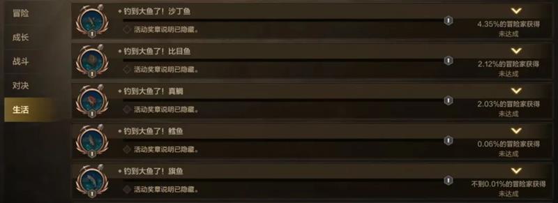 钓鱼爱好者可以挑战五个鱼类相关的隐藏奖章,需要在公会鱼塘钓到不同种类的鱼。值得注意的是,即使当日钓鱼奖励次数用完,玩家仍可以继续钓鱼来完成奖章任务。