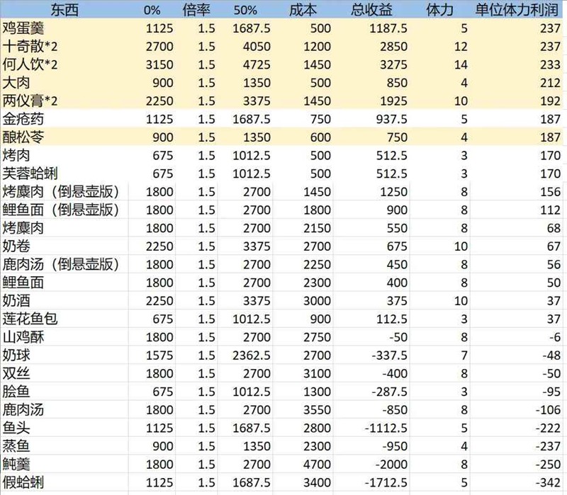 觉得好亏的可以看看包里有什么珍稀材料(同利润下耗体力越多越省事,所以还是优先做药!!微懒财迷推荐),去大世界配一下普通材料做成饭,懒得摸珍稀材料的,继续去大世界无脑摸鸡蛋羹的材料和草药(做大肉,肉没买到上限)就好了。