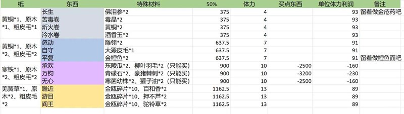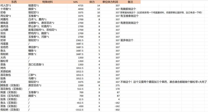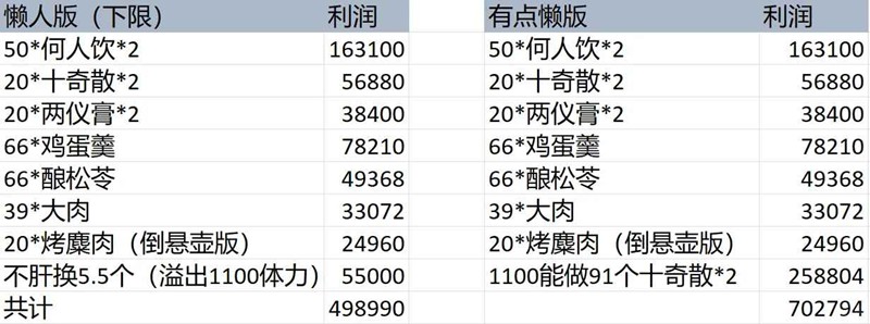 第一步:制作所有两仪膏、十奇散、何人饮(后面这俩草药使用性价比最高,耗体力多,纯买材料周一耗1140体力)。相信大家肯定会在跑图的时候顺手摘下草吧!所以其他特殊材料可以看下p2纯采集版本制作一下,体力耗的越多越好,毕竟人懒。这一步可能会用到每周扫荡生活超市的普通材料,因为全部量化做表格好麻烦我只做了珍稀鱼肉和鸟肉购买的版本,没有做只买草药等普通材料的买采交叉版的饭药利润表,但是总归是比纯买利润要高的。