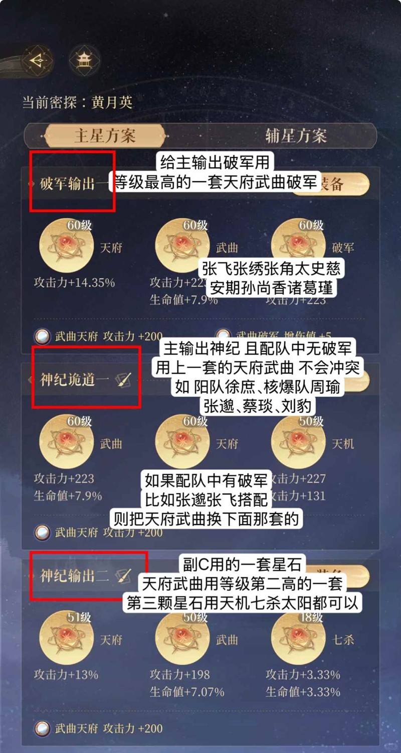 主输出用最好的天府武曲+天机/破军,副输出用第二好的