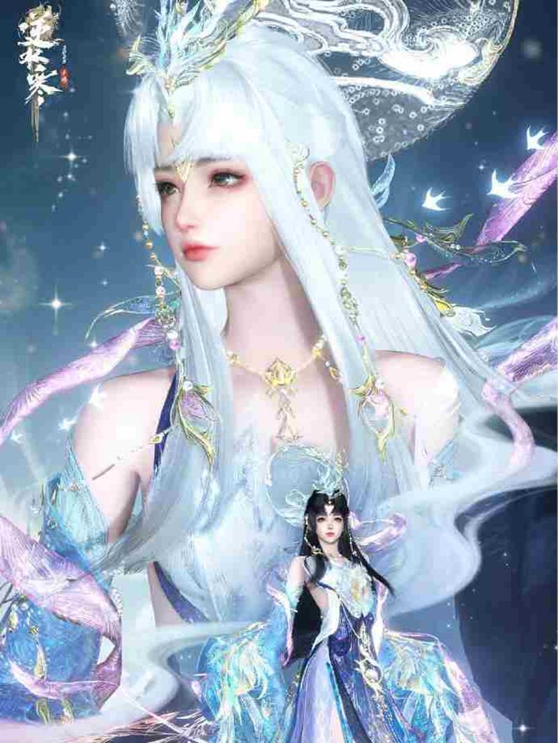 同款天赏发型【鸾栖】:纯白无瑕的长发搭配神鸟发饰,展现上古神祇的尊贵。