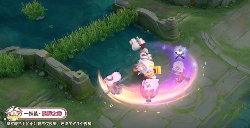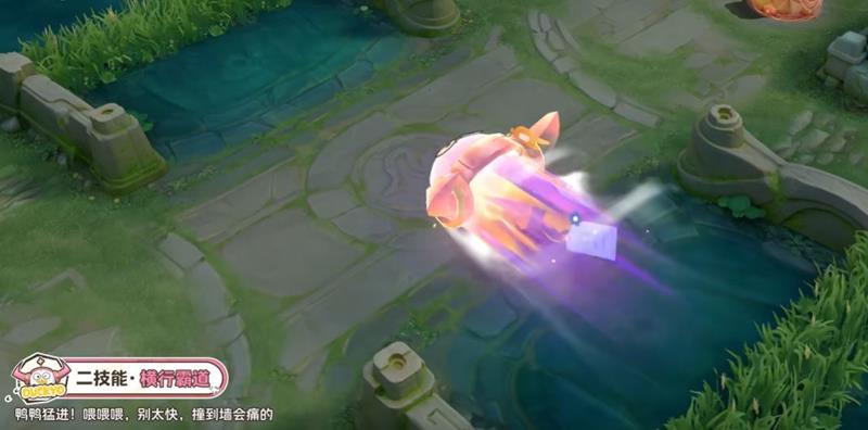 二技能特效:牛魔戴鸭头套冲刺,像在喊“鸭鸭猛进”,冲刺时上方有一朵小花花,整体表现非常可爱。