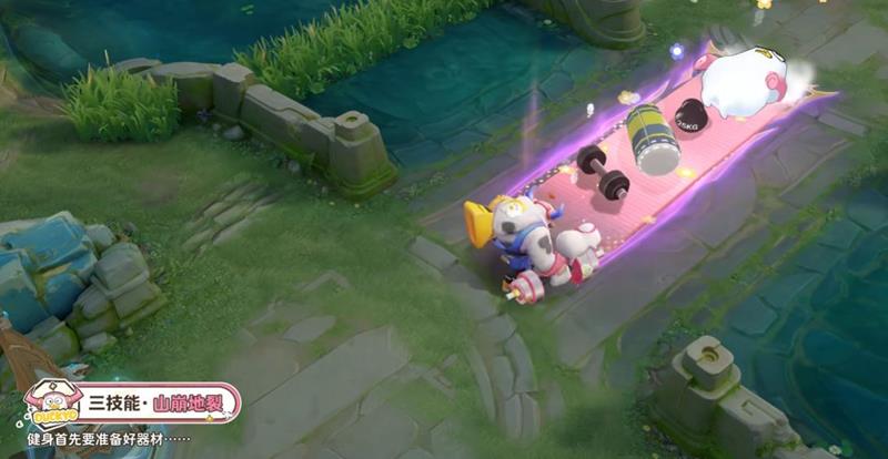 三技能特效:使用后会出现健身小刘鸭,瑜伽垫、哑铃全上场,一个一个向前铺垫,还有小花花元素。