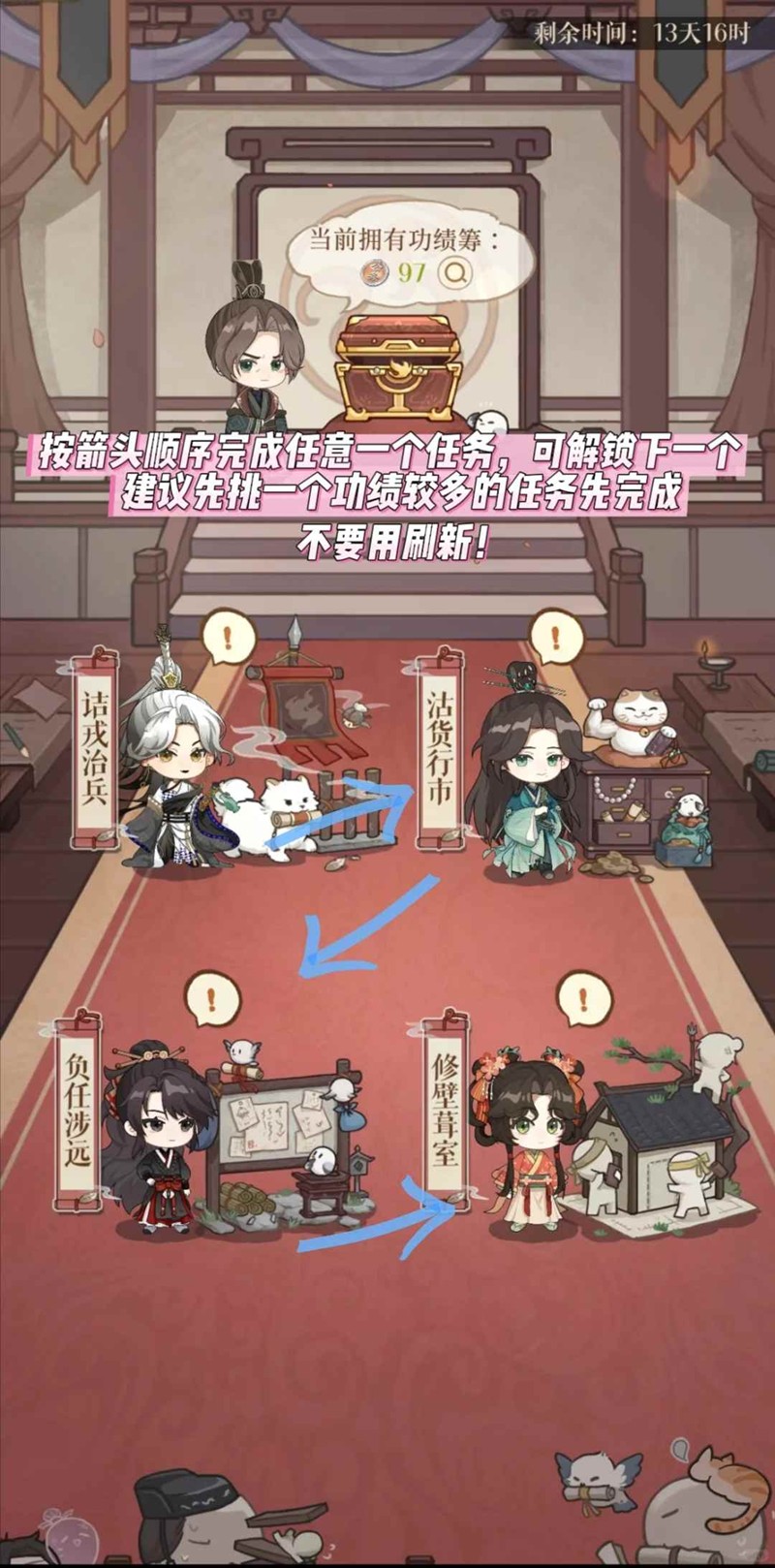 任务分类:战斗类、知识问答、神秘事件(类似情报)、材料合成(家具)