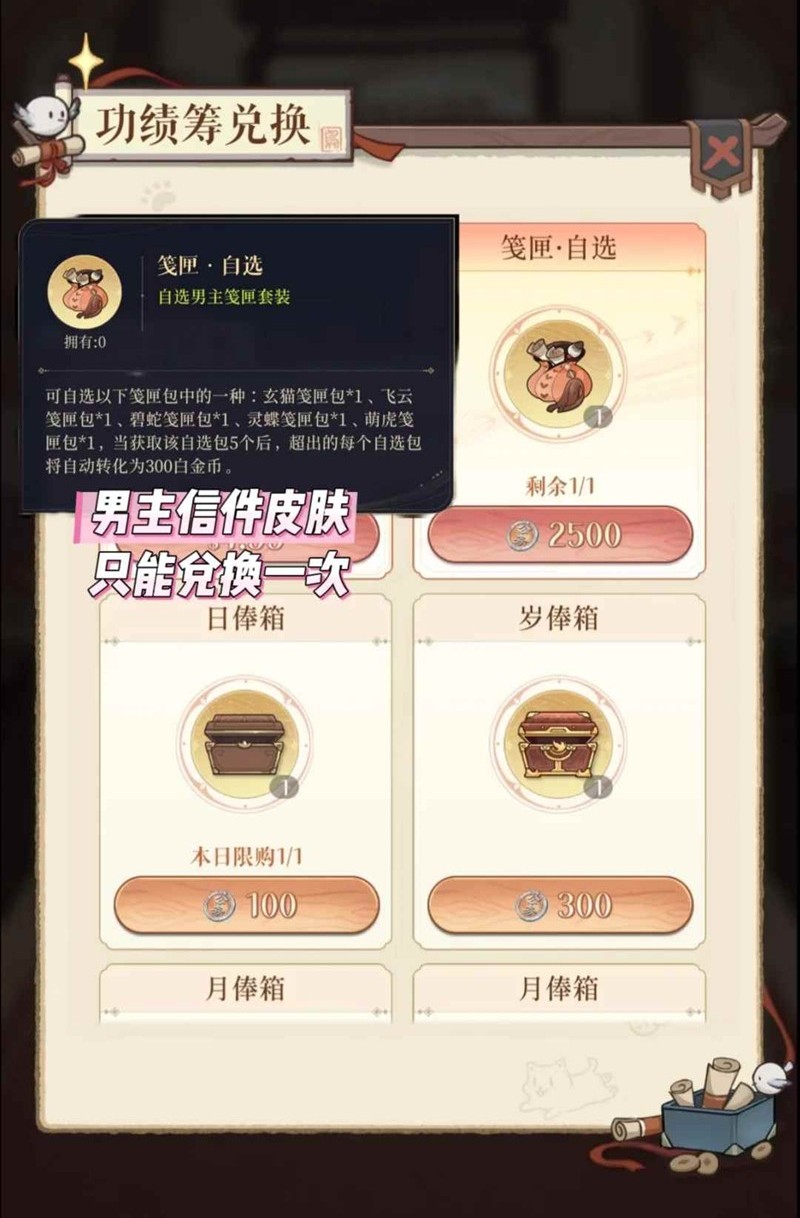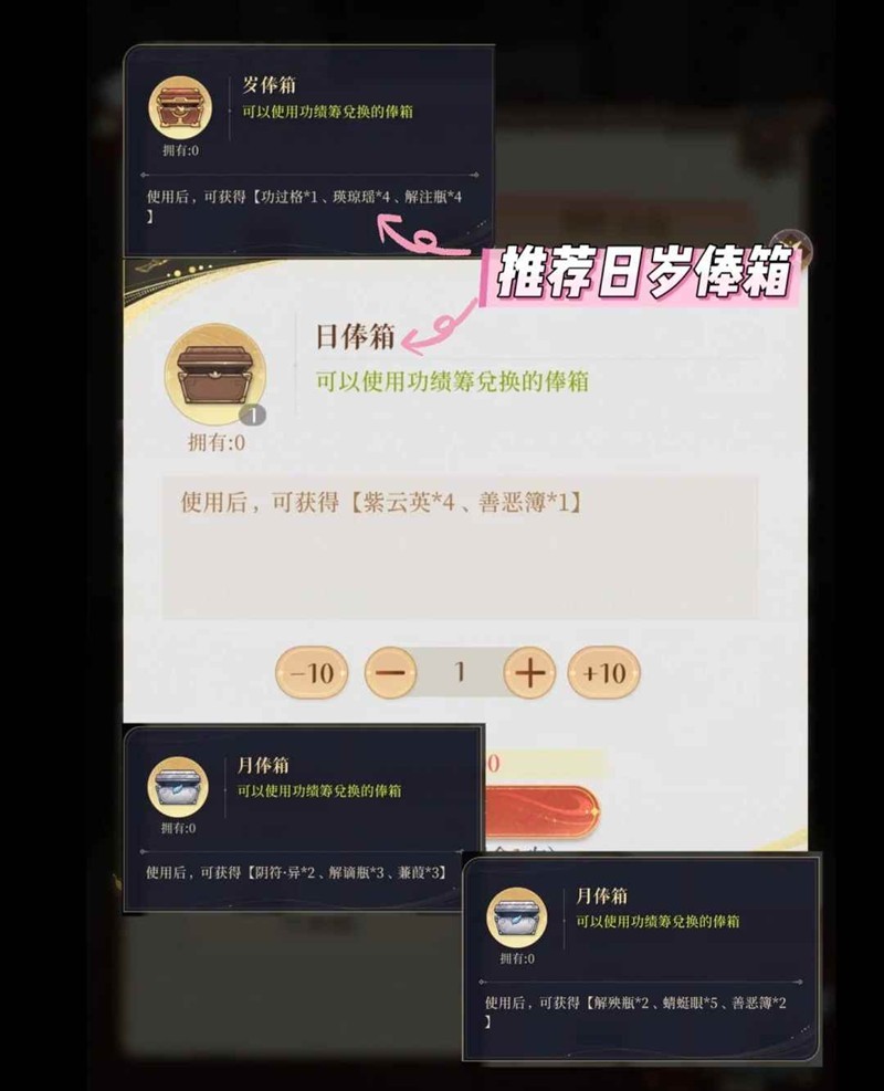 【日俸箱】开启后可获得紫云英*4善恶簿*1,每日限购1个,必买!