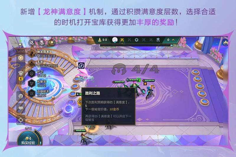 同时,金鳞龙、玉龙等羁绊效果焕新升级,全新的运营思路和趣味玩法,让玩家在对局中体验到更爽快的战斗,巨龙之巢标准排位组队不限段,任何段位的玩家都可以组队同局,最多支持4位弈士组队,开黑体验更随心。