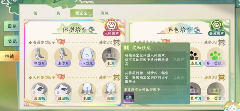 解锁大师徽章后,福宝宝体型因子概率会大大提高,羽纱闪闪光才能遗传!
