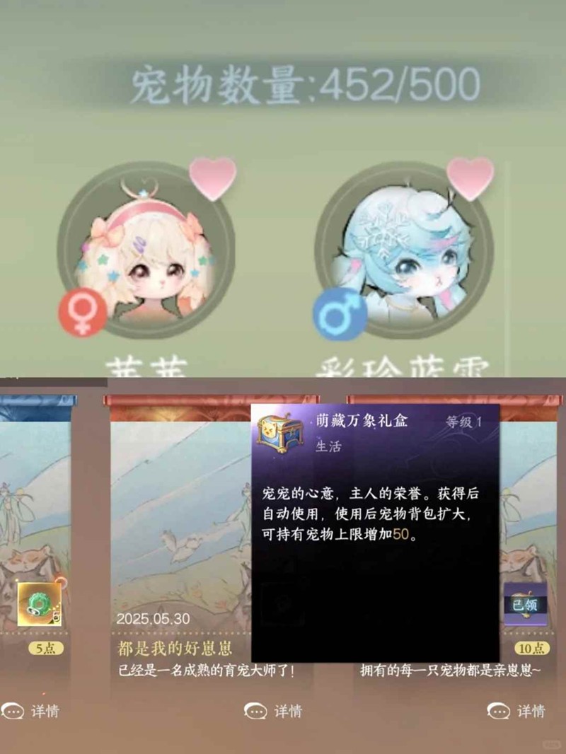 寒子藏的好深,在菜单-收藏-万象-宠物那里,领取【是我!超级育宠师!】的成就奖励后扩容至500个。再也不用纠结该清哪个宝宝啦!