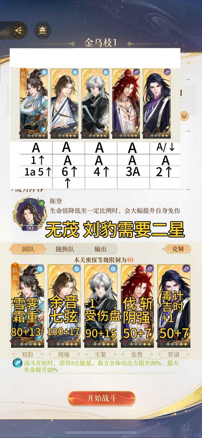 ps:星石和攻击要求不是死的,攻击高星石就可以差一点,星石好攻击就可以低一点,周瑜不能放三号位,攻击存在一定顺序,第一轮A或者下拉都可以,看密探血量决定