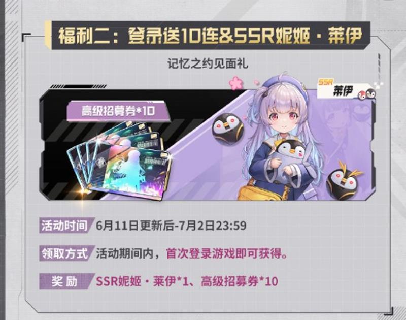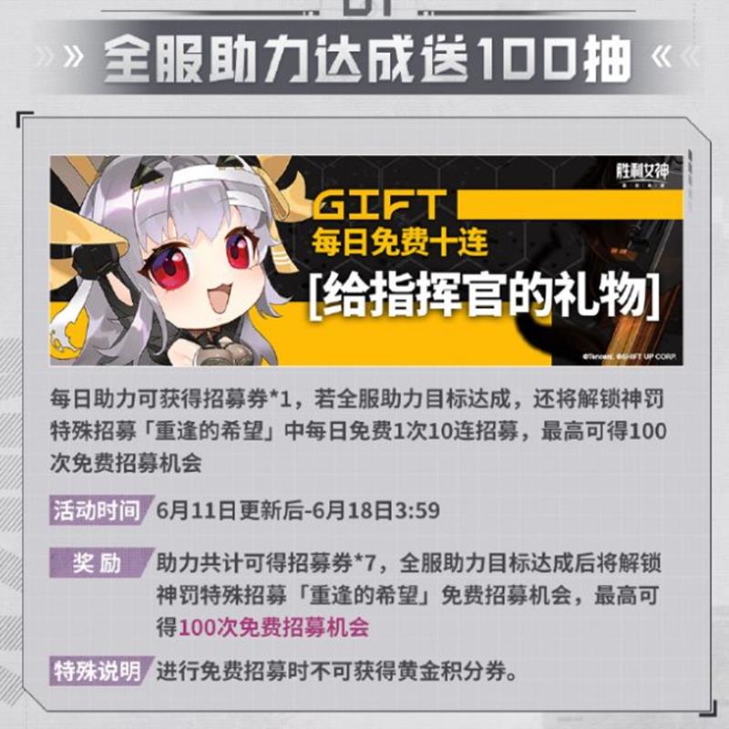 限时活动与福利:新版本的核心活动“OVERZONE”将于6月11日更新后至7月2日开放,玩家可以参与活动获取丰厚奖励,包括高级招募券、养成素材等。此外,全服助力活动将送出多达100次的免费招募机会。