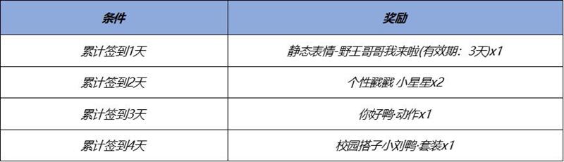 签到奖励:累计签到1天可获得限时表情“野王哥哥我来啦”(3天);签到2天可获得个性戳戳-小星星x1;签到3天可获得“你好鸭”动作;签到4天即可领取“校园搭子小刘鸭”套装。