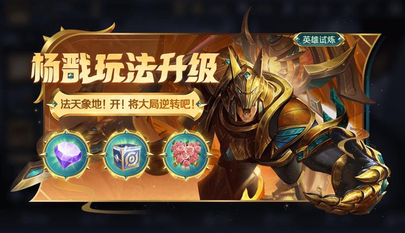 英雄试炼·杨戬:杨戬玩法升级,活动期间可免费试用杨戬英雄及埃及法老皮肤,完成任务更有丰厚奖励。