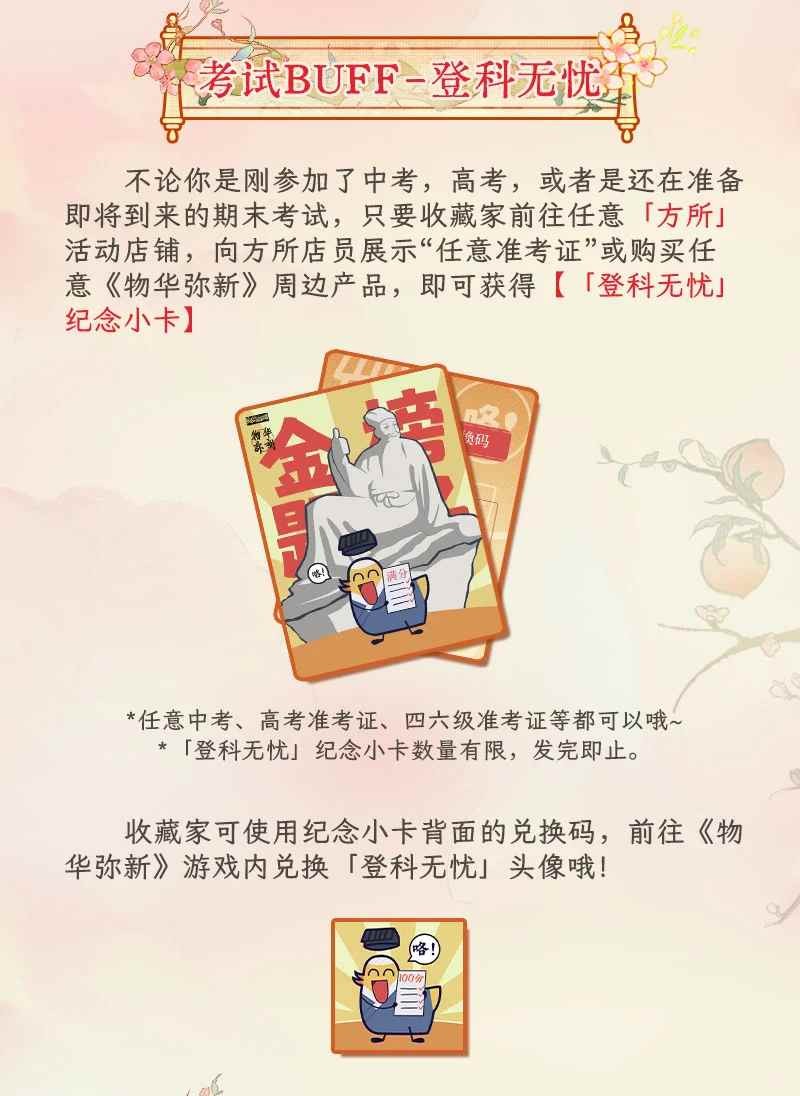 *收藏家可使用纪念小卡背面的兑换码,前往《物华弥新》游戏内兑换「登科无忧」头像哦!