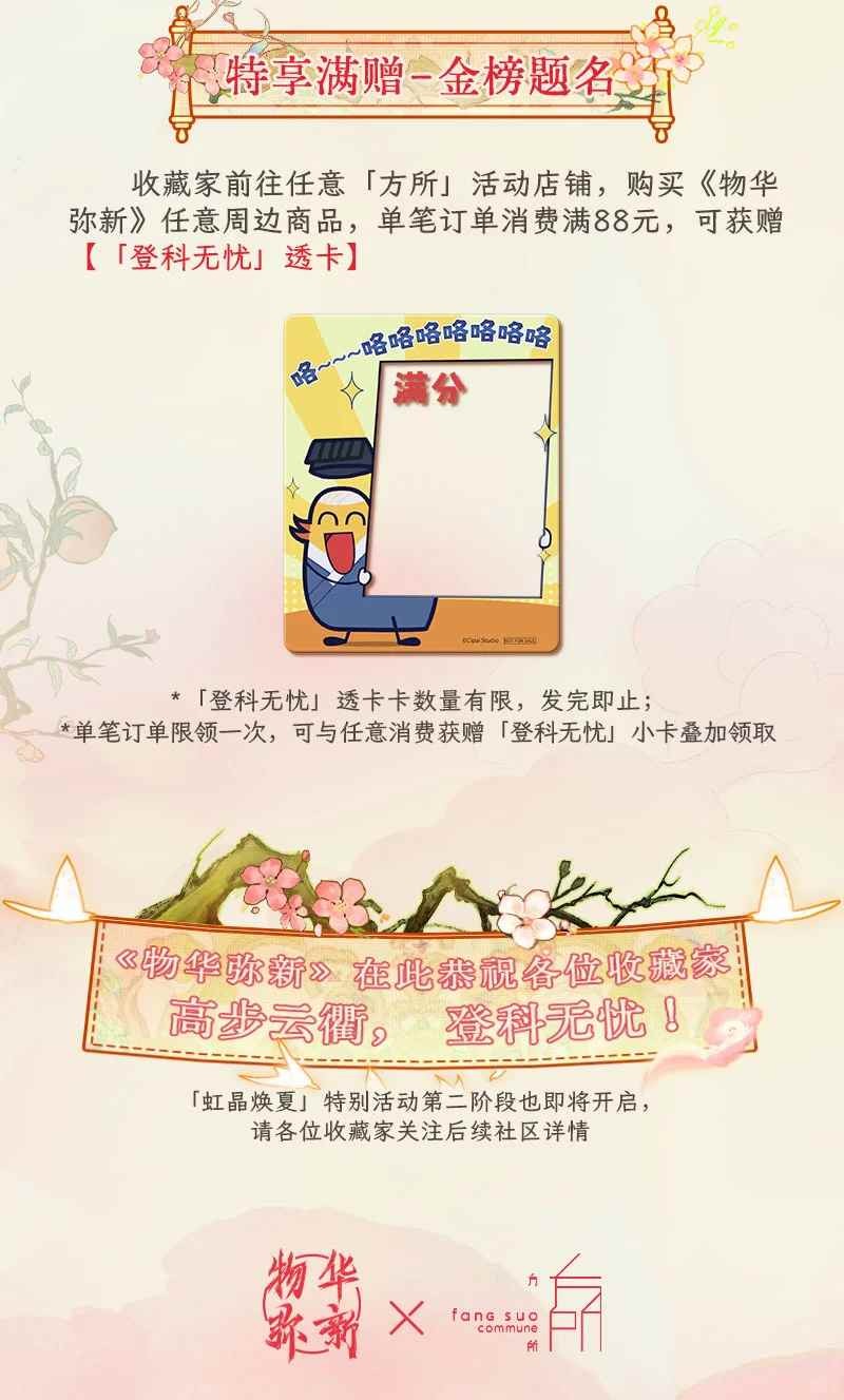活动期间,收藏家前往南京方所(就是本人),向店员出示“任意准考证”或go任意@物华弥新 周边商品,即可获赠“「登科无忧」纪念小卡”*1
