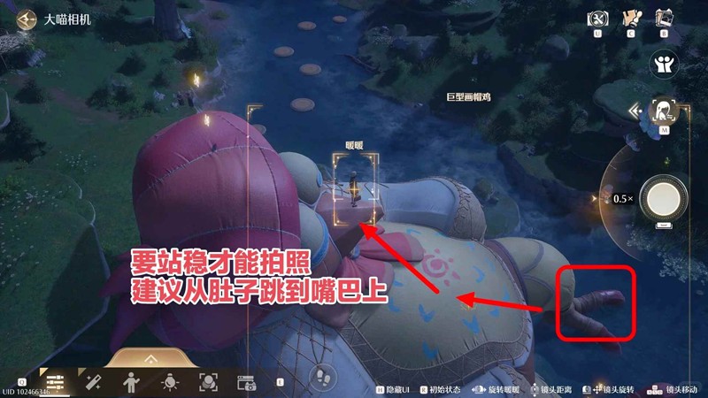 建议从画帽鸡的脚部开始跳上去,然后由肚子跳到画帽鸡嘴上站稳,只有站稳才可以开始拍照,有2个拍照框,可以拉远点拍照距离