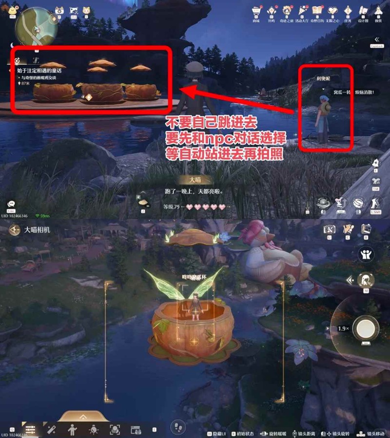 自己跳进去拍照不算,需要先找npc「利奥妮」选择乘坐方案,选完之后自动站进去再开始拍照,有多个拍照框