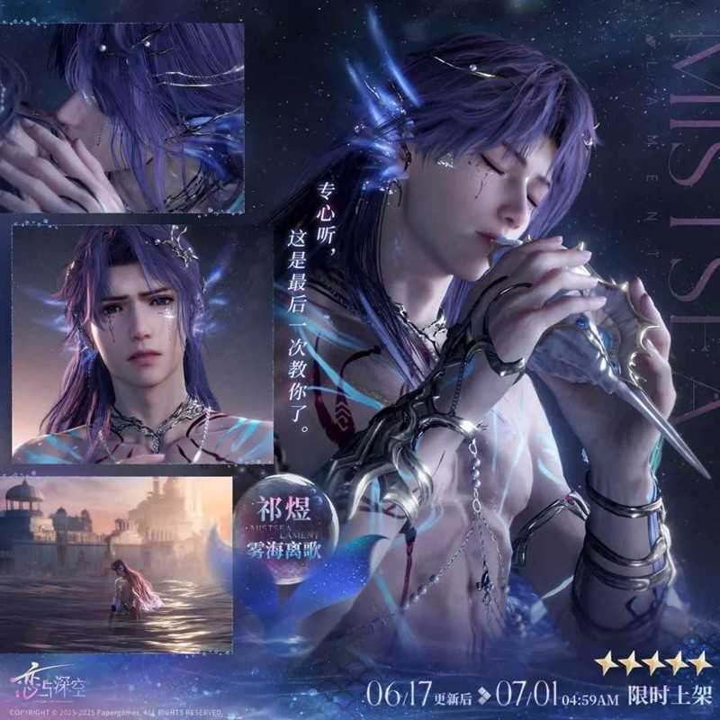 6月17日更新后~7月1日上午4:59,五星日冕套装思念「祁煜·雾海神临」、「祁煜·雾海离歌」开放获取。