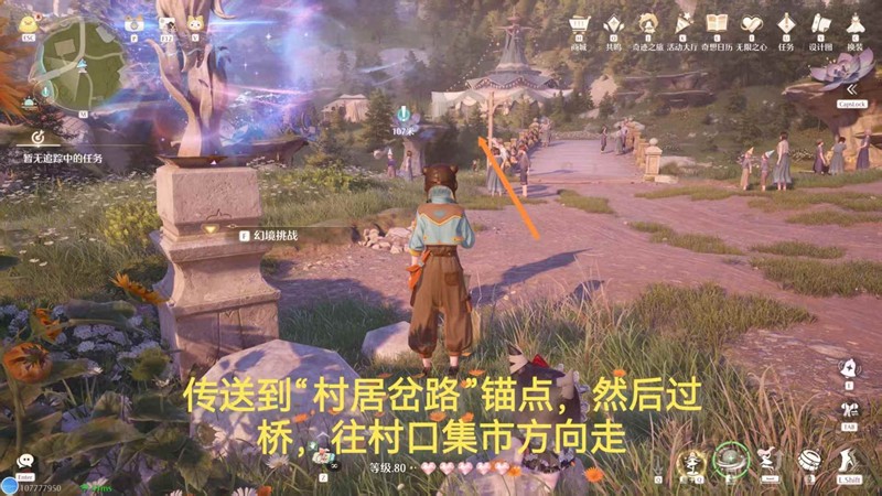 我们传送到“村居岔路”锚点,然后过桥,往村口集市走;