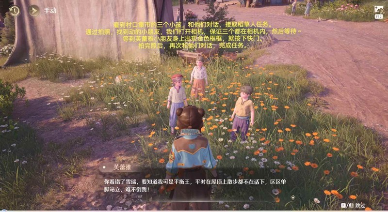 看到三个小朋友,和他们对话,接取“稻草人不许动”游戏任务;