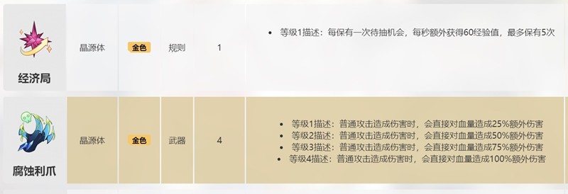 经济局作为金色生存牌,能通过保留待抽次数为玩家提供持续经验收益。每保留一次待抽机会可获得每秒60点经验值,最多可叠加5层效果。