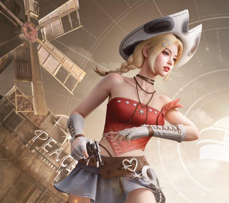“荒原牛仔”皮肤分为男、女两款,女角色的装扮尤为引人注目。她身着经典的牛仔帽与牛仔外套,搭配白色无袖T恤和喇叭牛仔裤,裤脚处还点缀着爱心和猩猩图案,展现出一种既酷炫又俏皮的风格。男角色则以干净利落的白色无袖T恤搭配牛仔裤,整体造型简洁大方,充满了西部牛仔的不羁与自由。